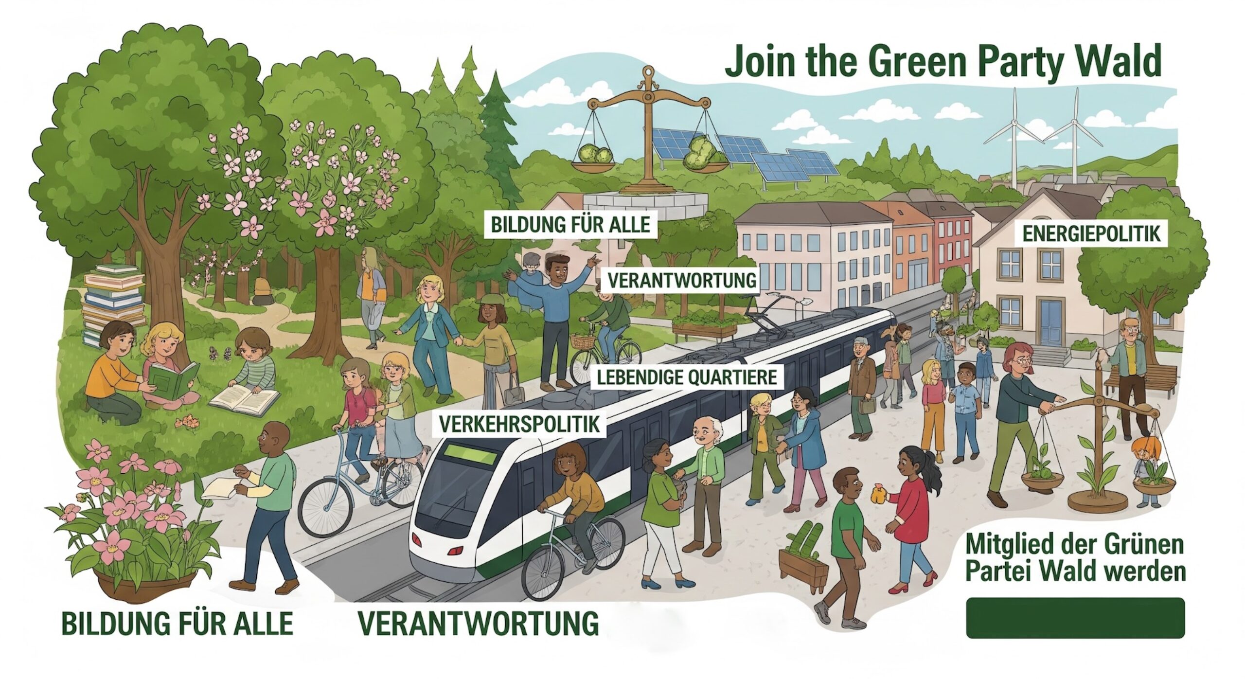 Als Mitglied können Sie mitreden und mitentscheiden. Und Sie können mithelfen, Wald den Kanton, die Schweiz und damit letztlich die Welt grüner, sozialer, ökologischer und demokratischer zu machen. Für unsere Aktionen und Projekte sowie für die Mitarbeit in den Gremien sind wir auf das Engagement möglichst vieler angewiesen. Es ist nicht nötig, einen Schweizer Pass zu haben, um den Grünen beizutreten. Wir sind der Meinung, dass alle Menschen am politischen Geschehen teilhaben sollten.